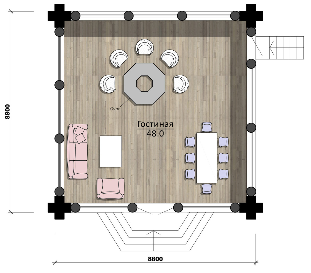 Беседка идеально подойдёт для тех, у кого есть много друзей, любящих вместе собираться на весёлые шумные праздники. Опционально может использоваться как бильярдная или небольшой спортзал. Отлично выполнит роль гостевого домика.