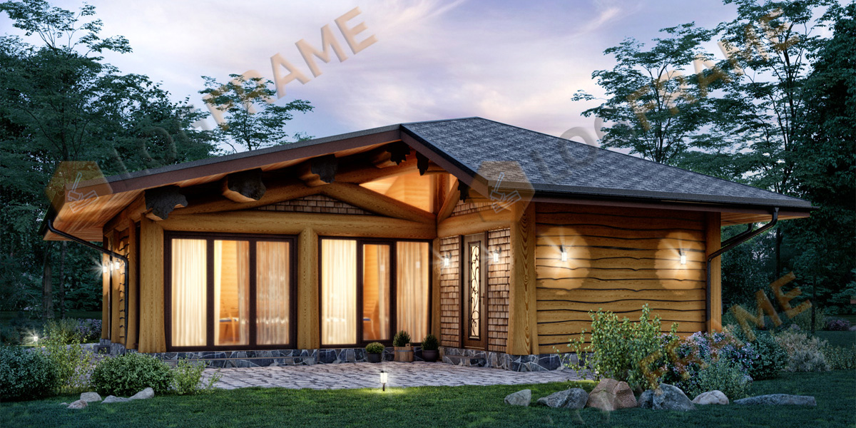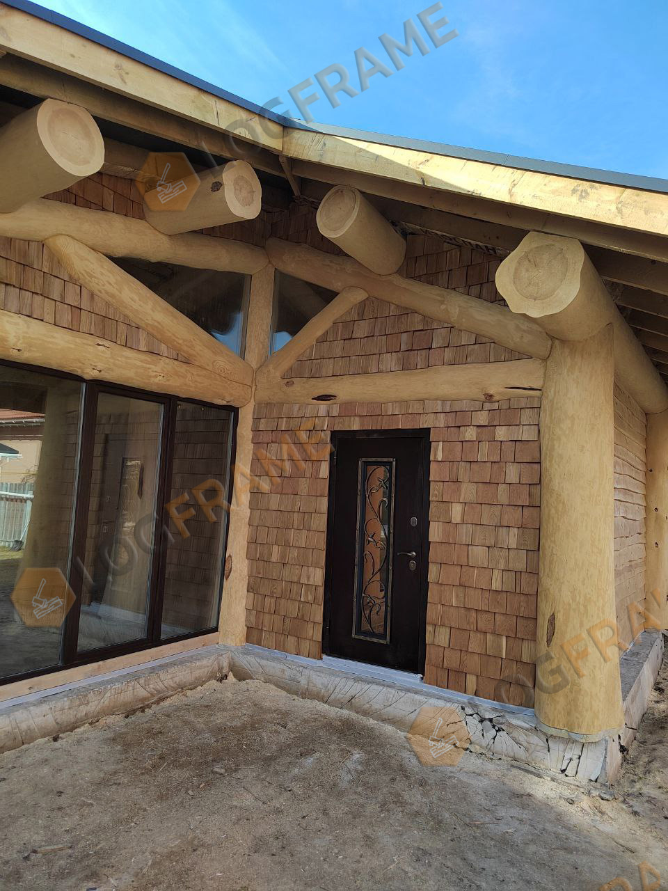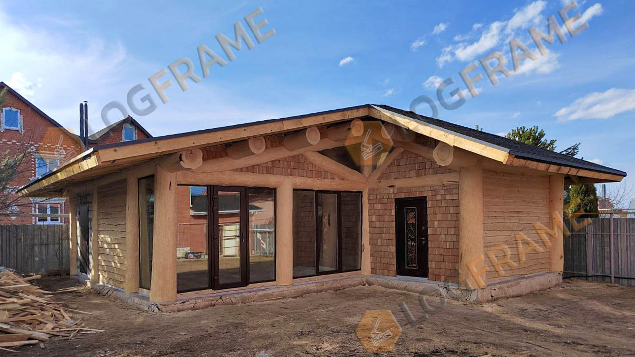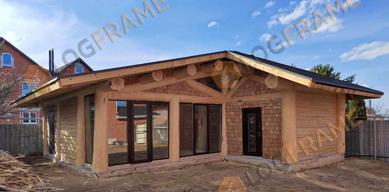 Бревенчатые балочные конструкции, необрезная доска в качестве отделки, в сочетании с камнем и лиственничным шинделем - создают неповторимый образ. Выглядит мощно, брутально, удачно вписывается в ландшафт и украшает участок.