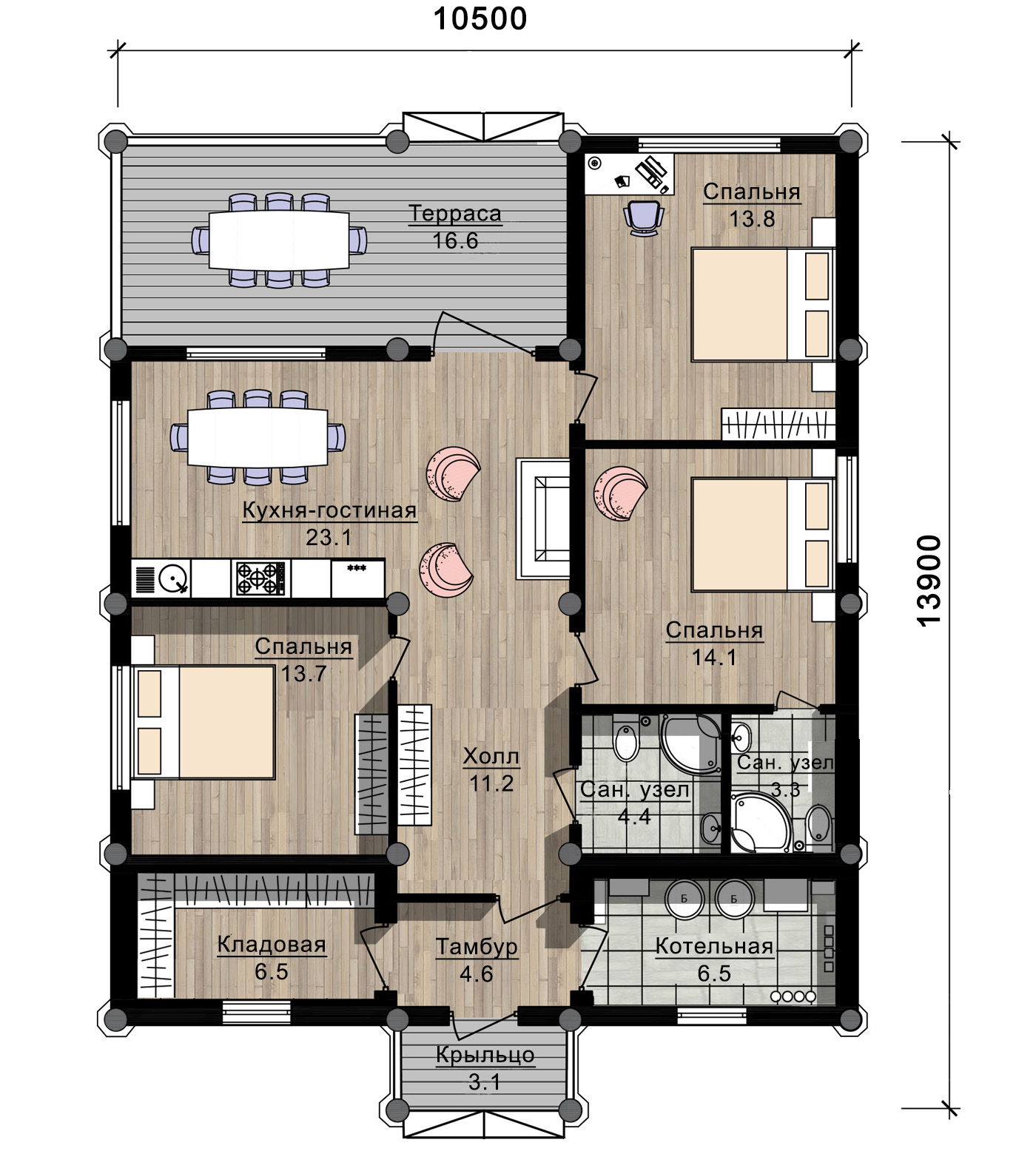 3 спальни, кухня-гостиная, терраса, 2 санузла, кладовая, котельная - есть всё необходимое для комфортного проживания. Нет только одного: лишних незадействованных площадей).
