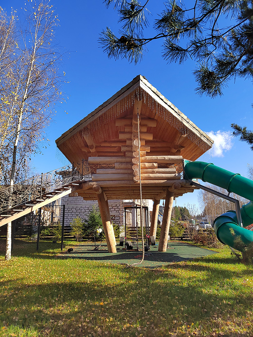 Домик для детей. Используется также как гостевой домик. Под домиком обустроена спортивная площадка с турниками, канатами, кольцами, тренажерами и гамаком.